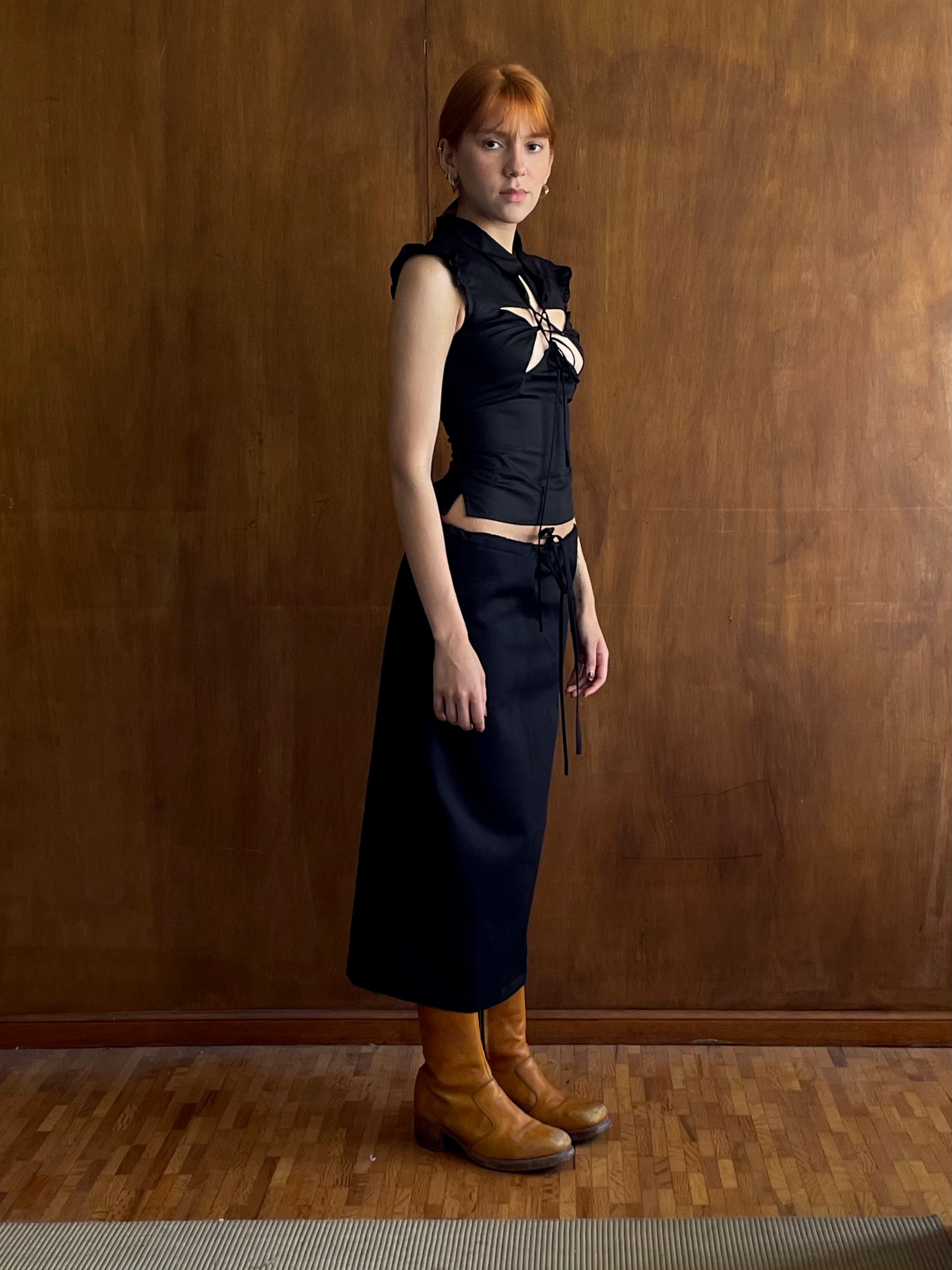 Pre-order the Angel Star Top in black fabric with a star cutout at the bust and corset detail at the back. It features a classic collar and gathered mini sleeves.