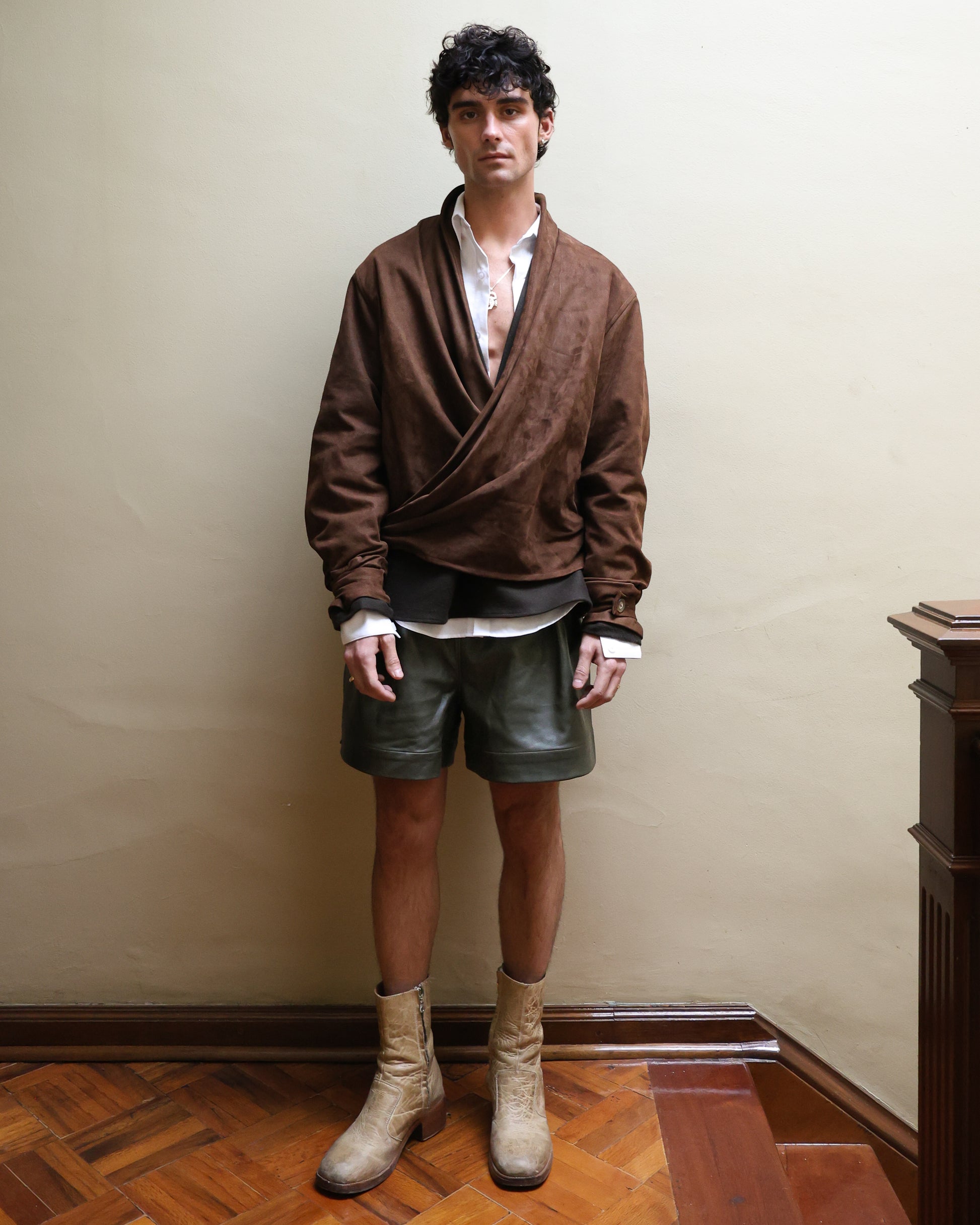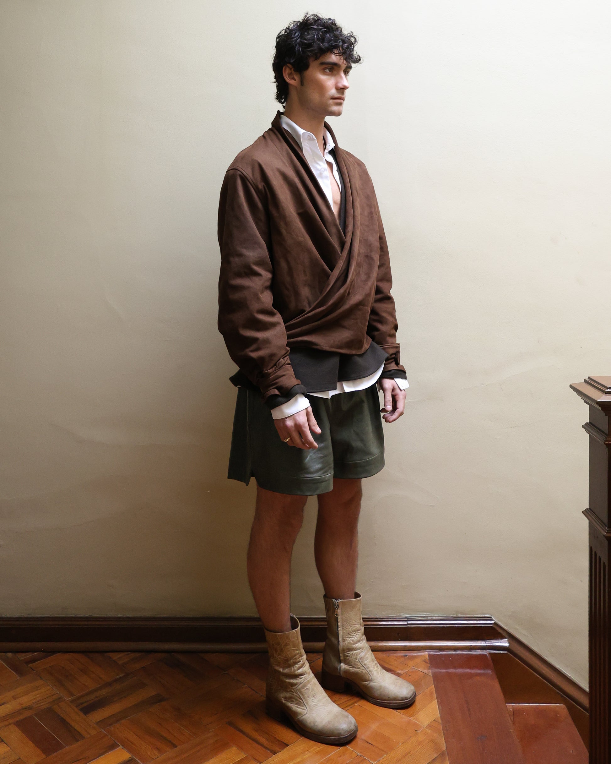 Chamarra cruzada de gamuza con cuello continuo y puños ajustables.