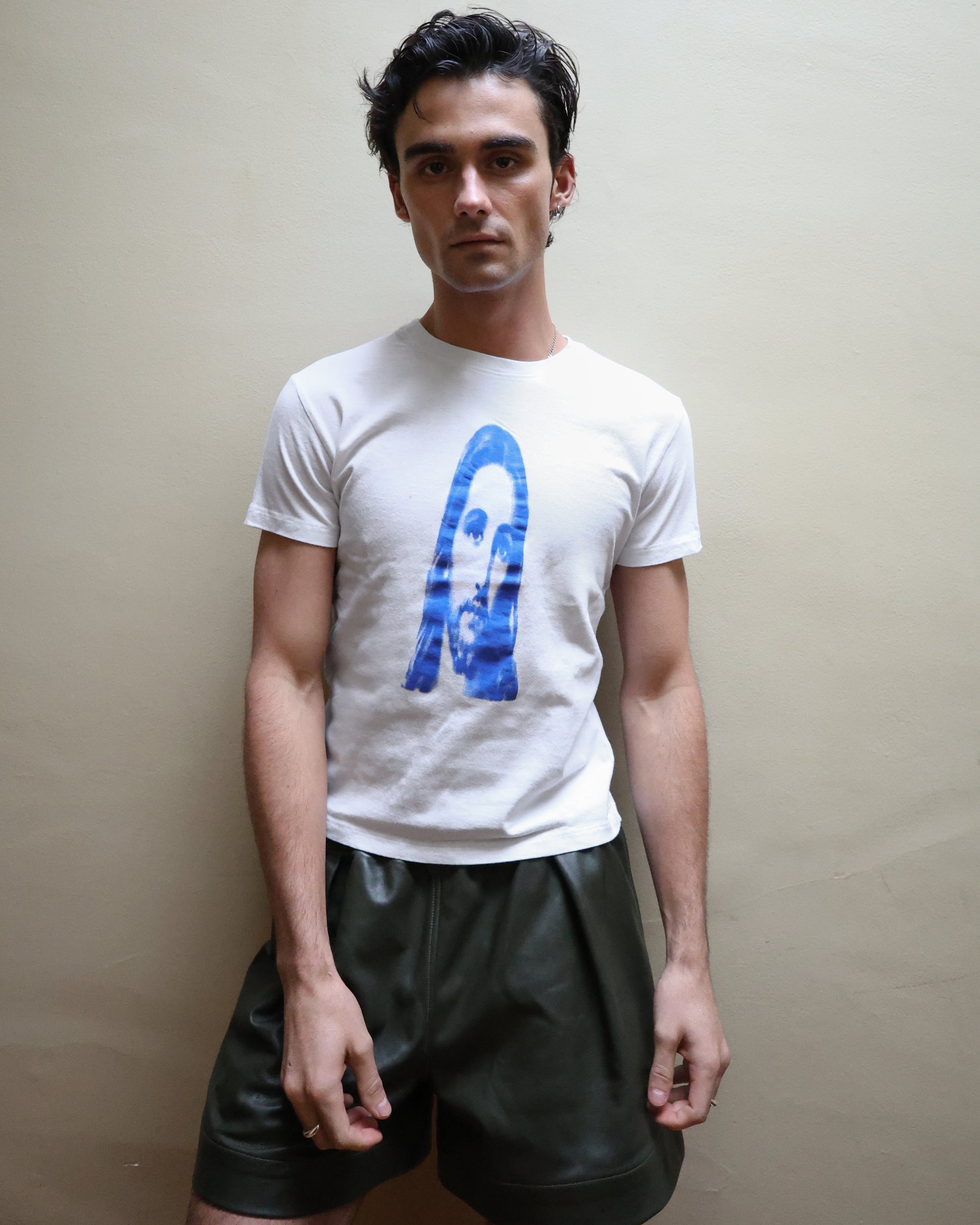 The short-sleeved Missonary ringer T-shirt with a blue bias on the sleeves and neck.