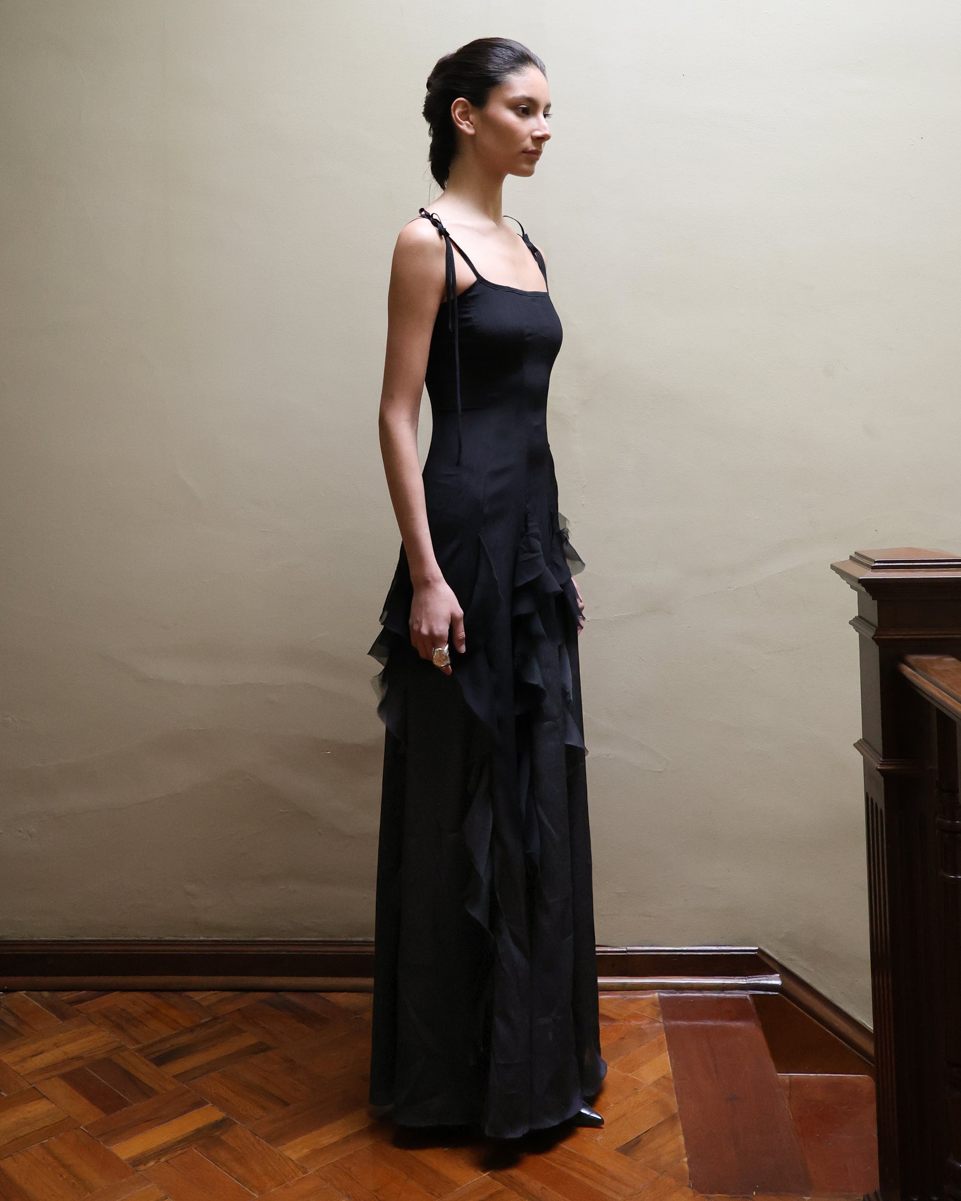 Vestido de seda corrugada con tirantes con corte princesa, espalda abierta en "V" y olanes inferiores.