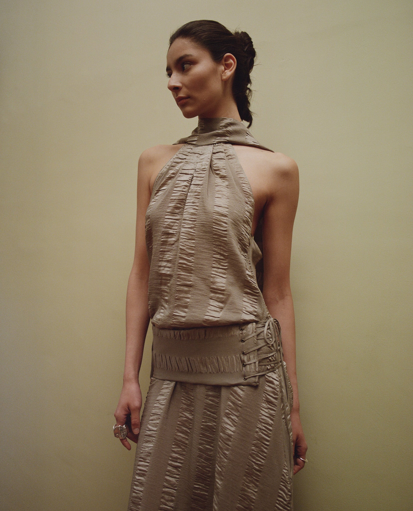 Vestido de seda corrugada con cinturón ajustable. Puede usarse con o sin cinturón para modificar la silueta y llevarlo más suelto. El cuello es doble, permitiendo estilizarlo de distintas maneras.